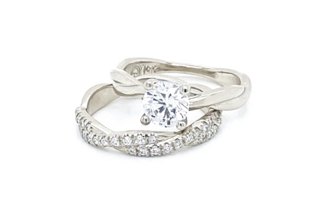 Handcrafted braided 19K white gold claw-set diamond solitaire ring. Shown with matching white gold pavé diamond band. Available with, and without pavé diamonds.