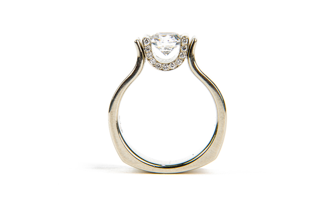 Solitaire ring in 19K white gold, with pavé horseshoe inspired details