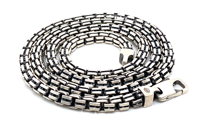 Industrial-inspired, this silver chain has a geometric square link design that is masculine and modern.