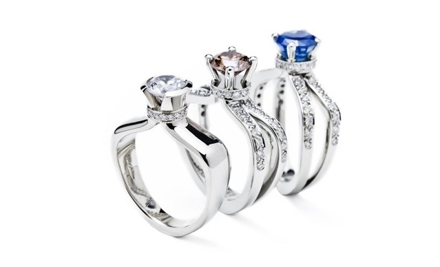 Shown with round brilliant diamond, cognac diamond and blue sapphire
