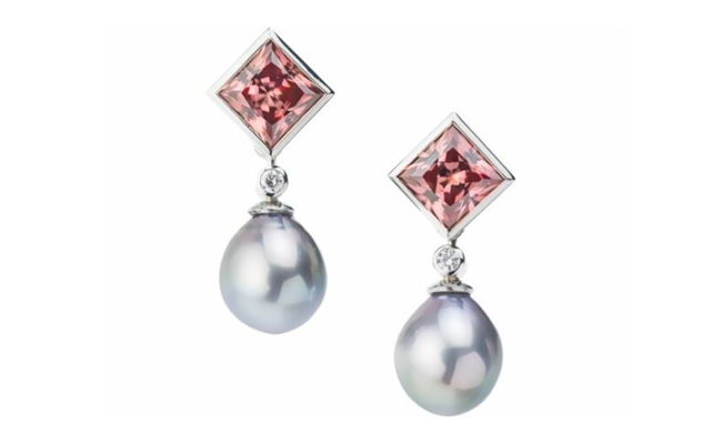 Rare bezel-set princess cut zircon studs in 19K white gold with diamond and Tahitian pearl drops