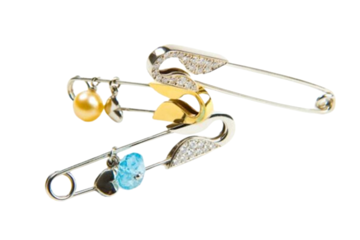 Two-tone gold safety pins, encrusted with diamonds and accented with gemstone and pearl charms